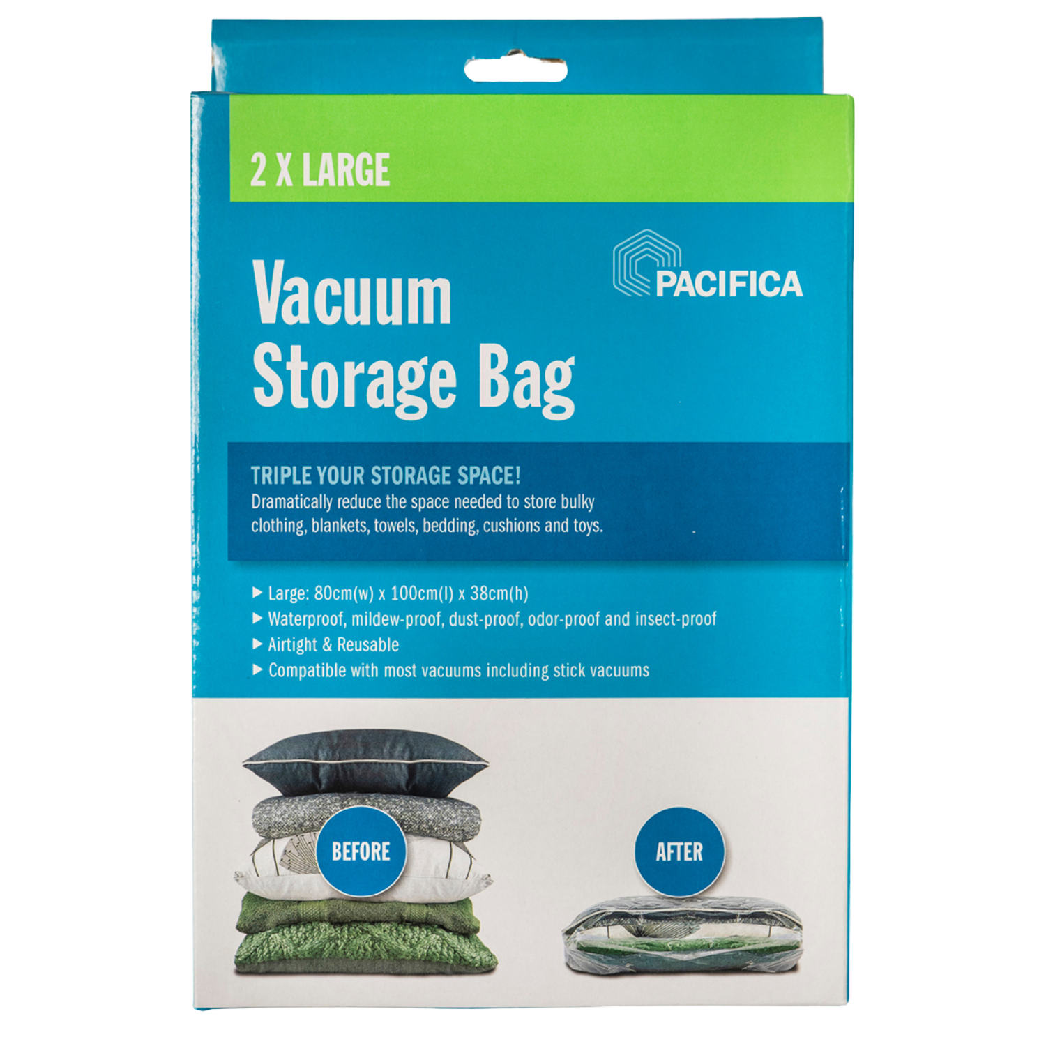 Looking for an easy way to store out-of-season clothing and bedding? The Pacifica Vacuum Storage Bags – Large are the perfect solution. These reusable airtight bags use vacuum compression technology to significantly reduce the space your items take up. Simply place clothes, pillows or linens inside, attach the vacuum nozzle and suck out the air. You’ll be amazed as the bags shrink down to a fraction of their original size. The x2 80w x 38h x 100d cm large bags maximize storage capacity while protecting your belongings from dust, moisture and pests. Stop wasting closet space and start getting organized with Pacifica’s innovative vacuum storage bags. Check them out today for convenient, space-saving storage.